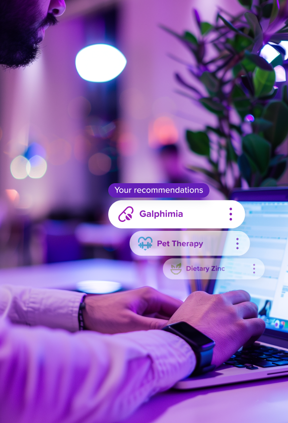 Our health recommendations engine enables our partners to deliver precise, personalized insights from a database of over 20,000 diet, lifestyle, and supplement interventions.
